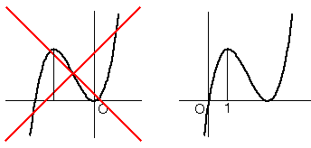 考えられるが、x=1で極大となることより、左の方のグラフは不可である。