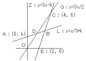直線Lの式はy=1/3x+k、直線Qの式はy=3/2x、直線Zの式はy=3x−6である。