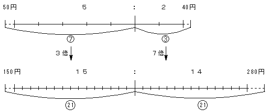 倍数算 答2 上の図において、7:3をそれぞれ3倍、7倍して、同じ量にします(図下)。 このとき、 15−14=1 1目盛分が 280−150=130 130円にあたります。 Aのはじめの値段は5目盛分なので、 130×5=650 答え 650円